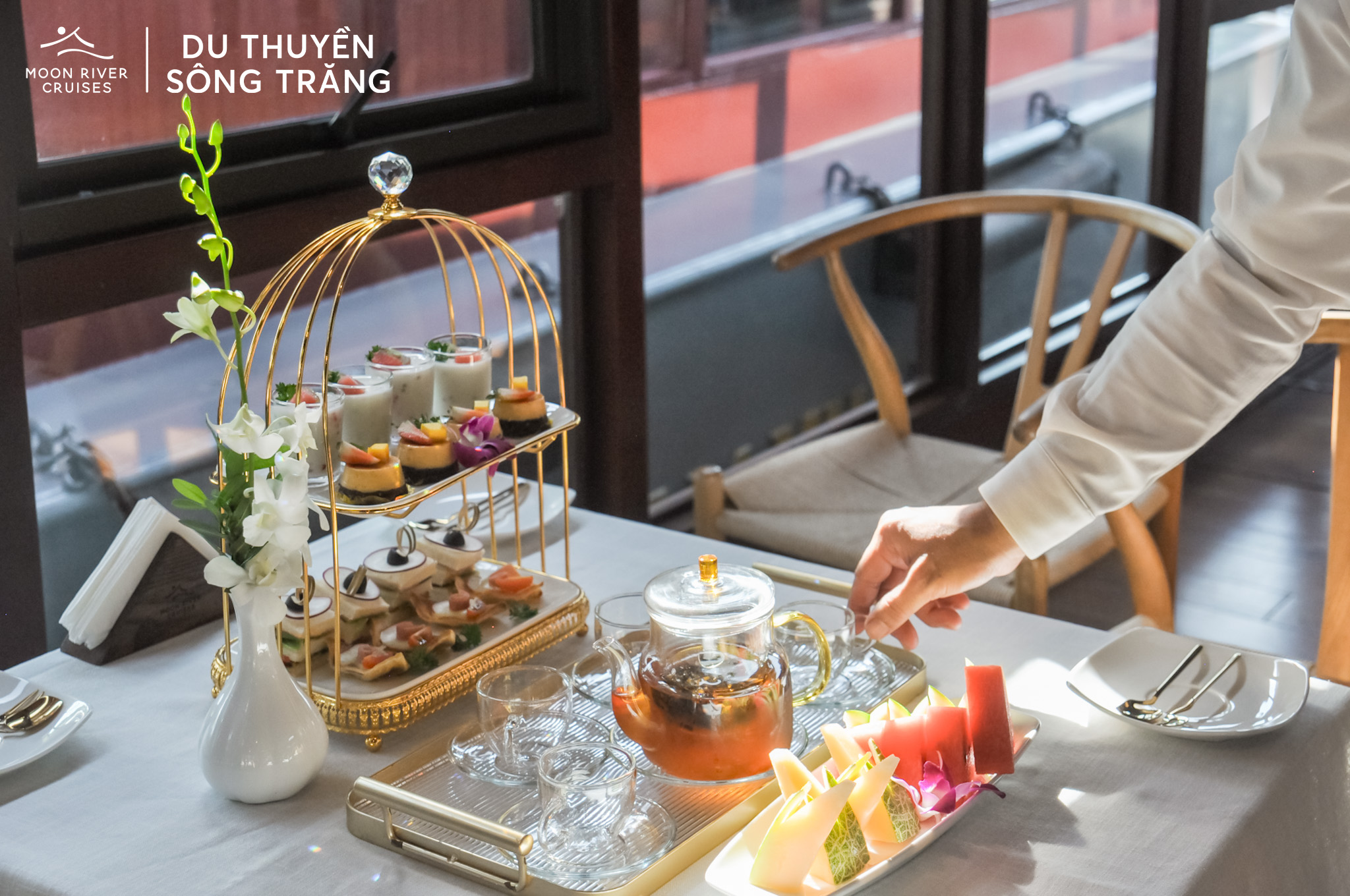 Thưởng trà chiều trên dòng Hương không chỉ là một dịp tuyệt vời để khách thương cùng gia đình, bạn bè thưởng lãm vẻ đẹp tinh tế của một bàn tiệc “ẩn chứa” nét xa hoa kiểu Anh do Du thuyền Sông Trăng công phu chuẩn bị với: bộ trà cụ tuyệt đẹp để pha trà thảo mộc (chế tác theo công thức riêng của thương hiệu); các loại bánh ngọt như gato flan hay sữa chua; bánh mặn với tart và sandwich; kèm trái cây tươi theo mùa.