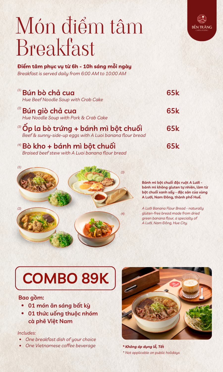 Combo ăn sáng 89.000VNĐ 01 món ăn sáng bất kỳ & 01 ly cà phê Việt Nam